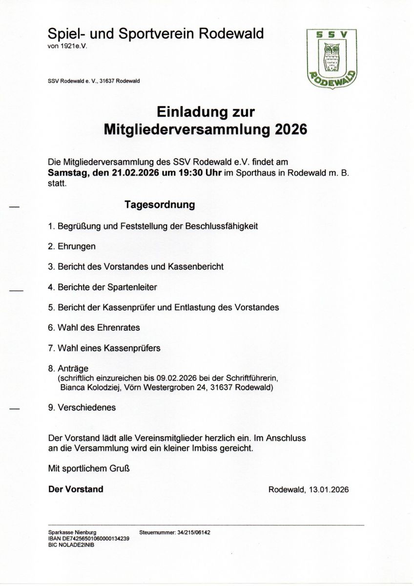 Die diesjährige Mitgliederversammlung des SSV Rodewald fand im Sporthaus "Im Zentrum" statt. Der Verein hat 560 Mitglieder in 5 Sparten.